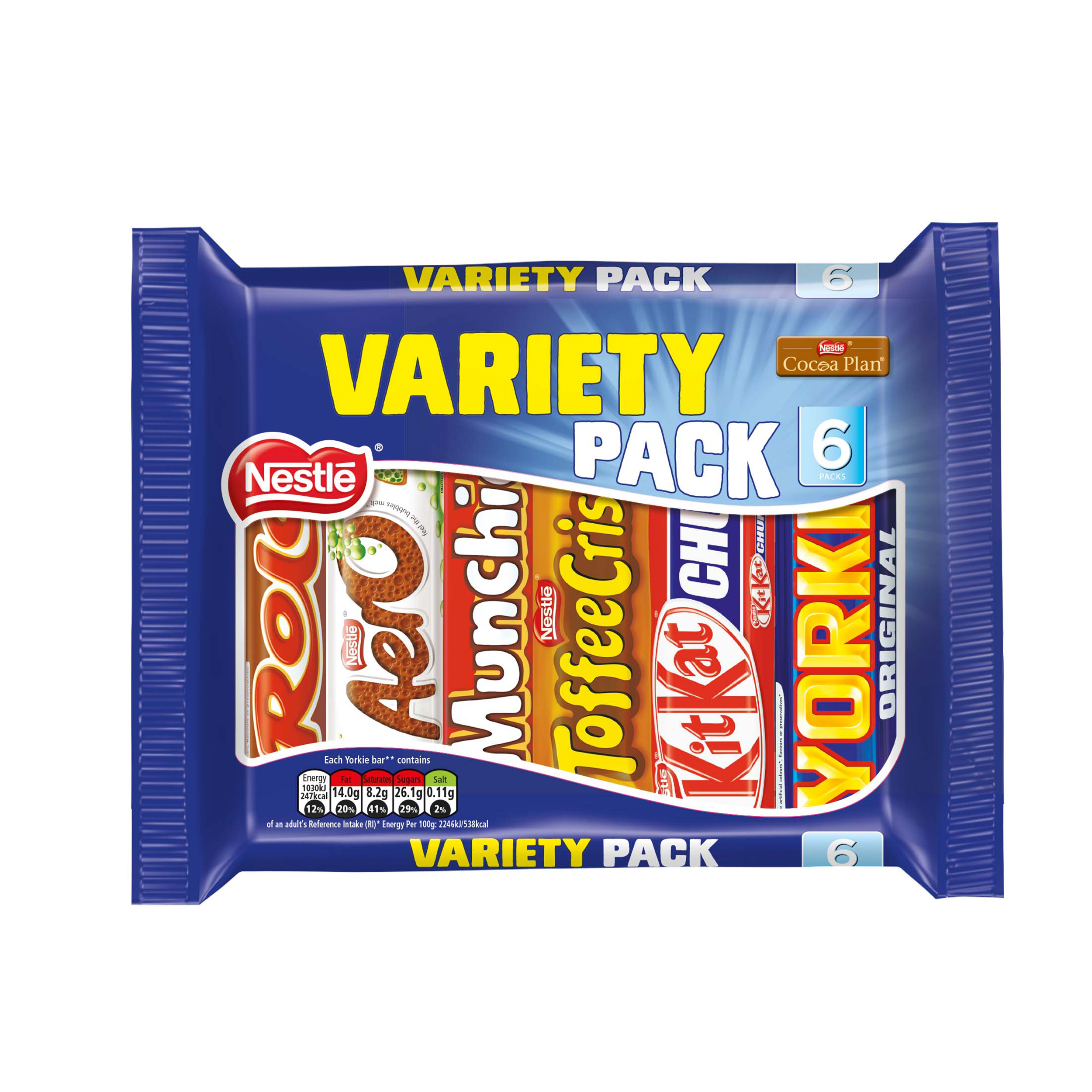 - Perfect for sharing, this Nestle Variety Pack contains 6 different delicious chocolate bars to suit a variety of tastes. Each pack contains 1 each of Mint Aero, Munchies, Rolos, Toffee Crisp, KitKat Chunky and Yorkie Original. The chocolate bars in this 264g pack contain no artificial colours, flavours or preservatives.
