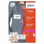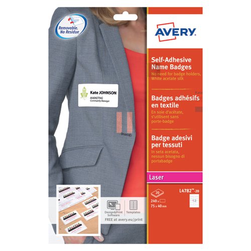 - These high-quality Avery self-adhesive name badges are made from acetate silk, which gives them a material-like look and feel. Ideal for visitors, conferences, meetings, events and more, simply print directly onto each badge using your laser printer, and they will stick securely to most fabrics, and remove without leaving any residue. Each badge can be removed with the backing to hand out or display for self-service. Each white label measures 75 x 40mm. This pack contains 20 sheets, with 12 name badges per sheet (240 badges in total).