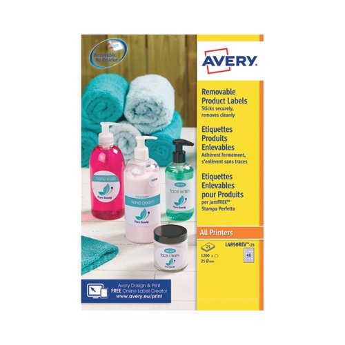 - Designed for use with all printers, these Avery removable labels stick securely to almost any surface and can be removed or repositioned without leaving sticky residue. JamFree technology has been developed for these labels to optimise them for smooth, uninterrupted use with your printer. Try Avery's free software and templates to design professional looking labels. These round labels are 25mm in diameter. This pack contains 1200 white labels.
